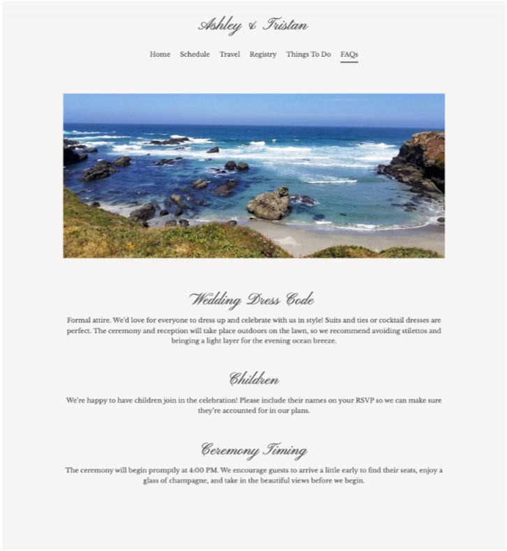 Wedding planning involves countless decisions, and your website shouldn’t be another source of stress. My goal is to remove the complexity from the process by handling the strategy, design, formatting, and technical setup on your behalf. You share your vision and details—I translate them into a polished, cohesive digital space that feels distinctly yours. The result is a professionally built wedding website that not only looks refined but also simplifies communication, keeps guests informed, and allows you to focus your energy where it matters most: celebrating your engagement and preparing for your day.